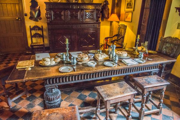The large refectory or dining table is around 400 years old. The top is not attached to the legs so that it can be turned over to the plain unpolished side to allow for the preparation and eating of food. It is on display laid out as if it is ready for a meal to begin.