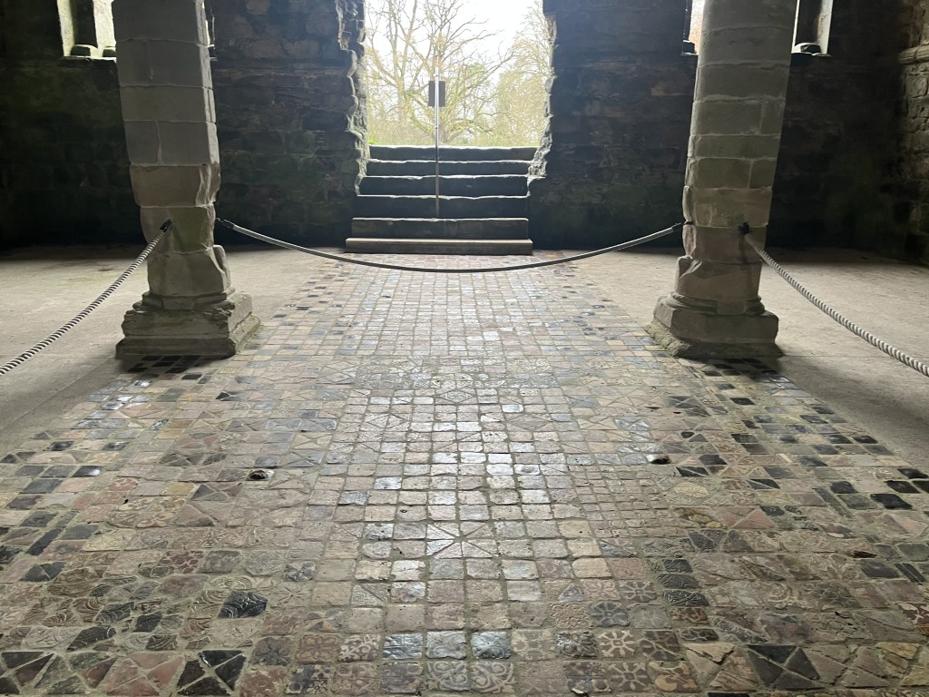 Buildwas Abbey is a lot smaller than Wenlock Priory, but it does contain one special thing and that is the chapter house with its amazingly intact tiled floor and decorative stonework.